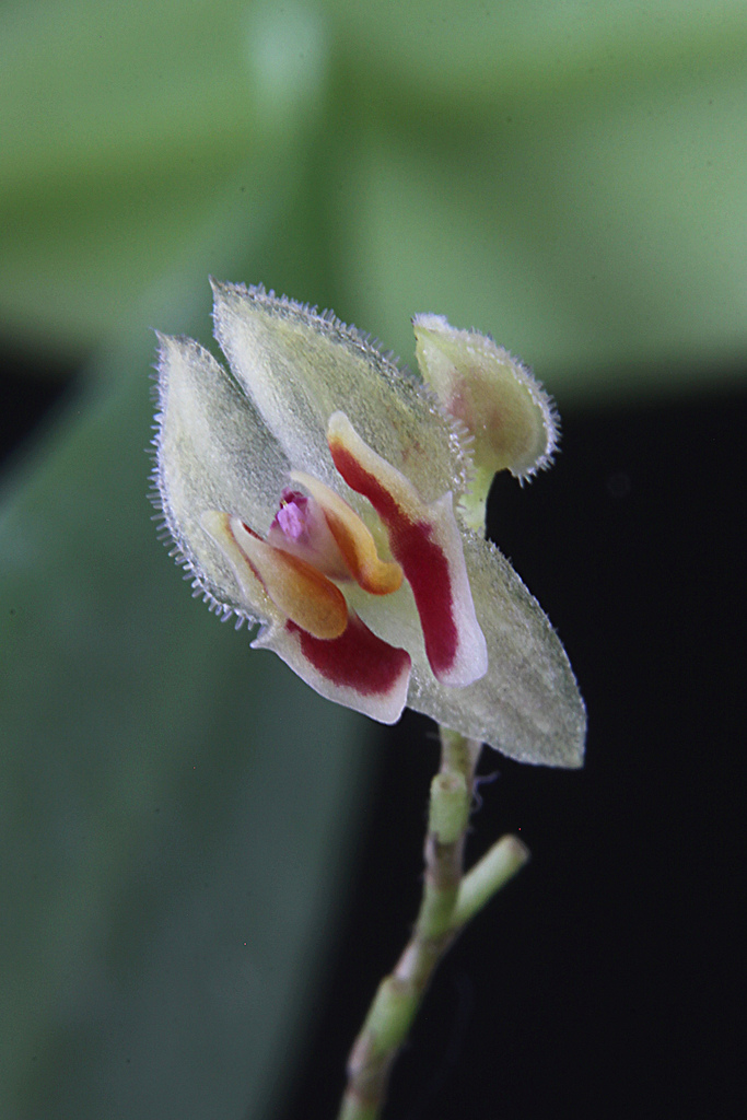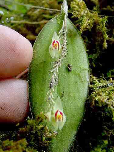 Found in Colombia, Ecuador and Peru on the western slopes of the Andes in very wet montane forests at elevations around 2700 to 3100 meters as a miniature to small sized, cold growing epiphyte with slender to stout, erect ramicauls enveloped by 9 to 12, gray, long-pubescent, lepanthiform sheaths and carrying a single, apical, erect, coriaceous, oblong-ovate, acute, acuminate, cuneate below into the petiolate base leaf that blooms at most any time of the year on a filiform, 1 to 1.2" [2.5 to 3 cm] long, congested, distichous, successively many flowered, racemose inflorescence arising on the back side of the leaf.