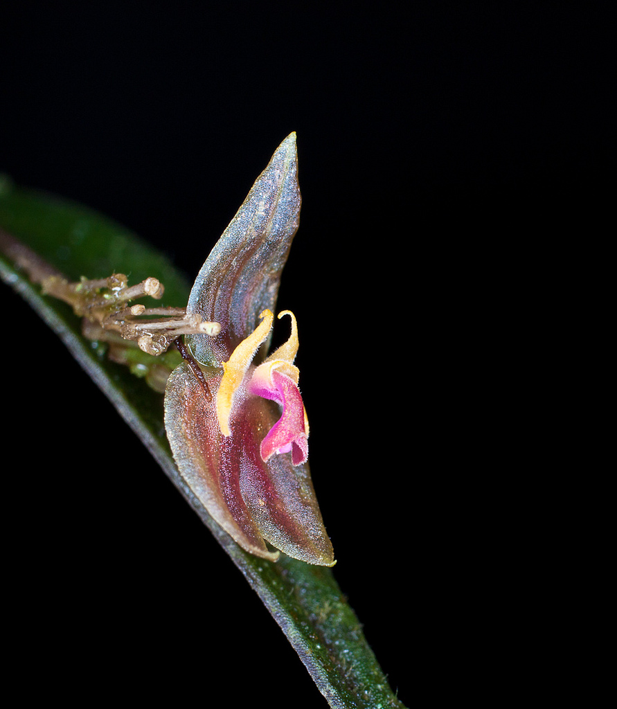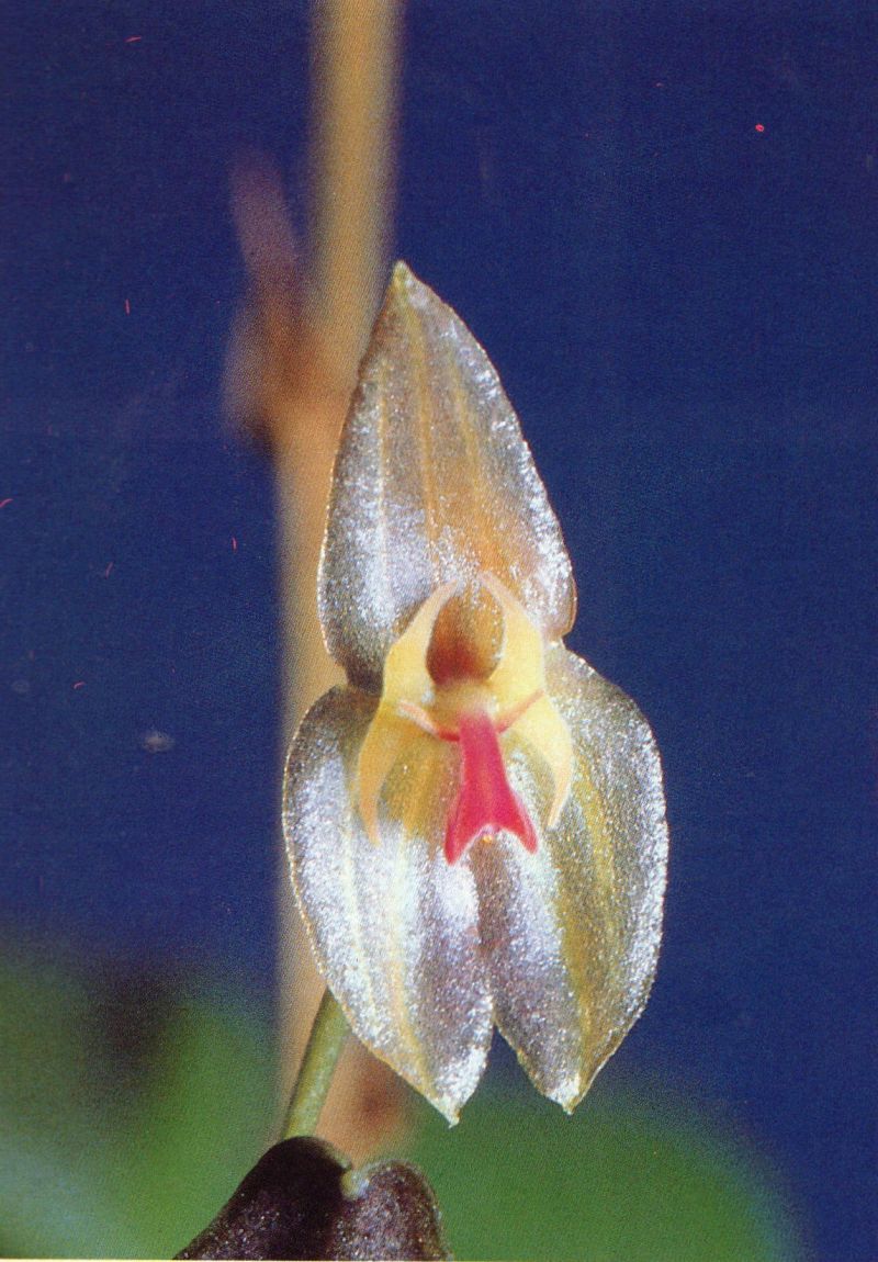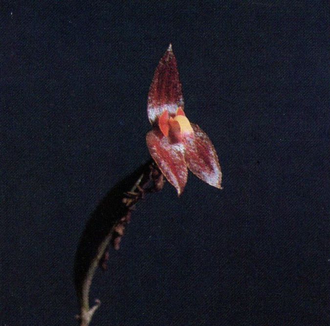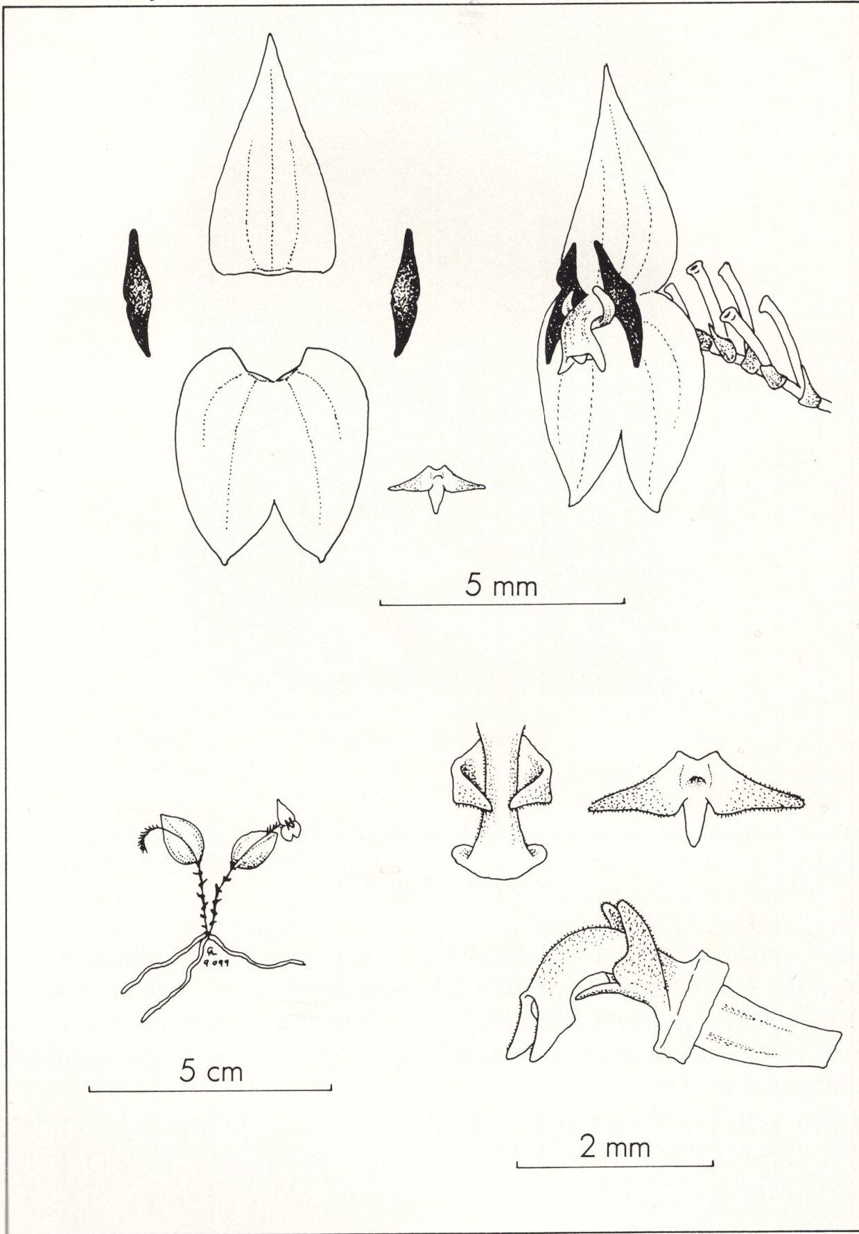 Found in Antioquia department of Colombia and Ecuador? at elevations around 2000 meters as a mini-miniature sized, cold growing epiphyte with a slender, erect ramicaul enveloped by 6 to 7, microscopically ciliate lepanthiform sheaths with dilated ostia carrying a single, apical, erect, coriaceous, ovate, acute, rounded and contracted below into the petiolate base leaf that blooms in the spring on a filiform, dense, secund, to .48 to 1.12" [1.2 to 2.8 cm] long including the .16 to .8" [4 to 20 mm] long peduncle, successively flowered inflorescence arising on the top of the leaf.