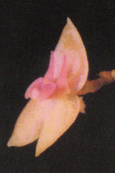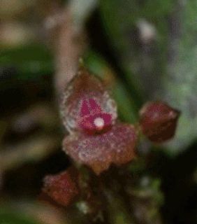 Found in Guatemala at elevations around 1600 meters as a mini-miniature sized, cool growing, caespitose epiphyte with filiform ramicauls enveloped by 3 to 4, gray-brown becoming dark rose, microscopically pubescent lepanthiform sheaths with dilated ostia and carrying a single, apical, erect, elliptic, reddish above, green beneath, tridentate, gradually narrowing below into the petiolate base leaf that blooms on 1 to 2, distichous, suncompact, arising on the top of the leaf, filiform, .12 to .28" [3 to 7 mm] long, successively single, few flowered inflorescence enveloped basally by floral bracts.