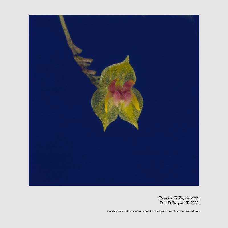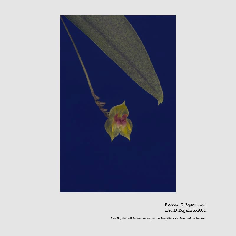 Found in Panama with out collection data as a mini-miniature sized epiphtye with slender, erect ramicauls enveloped completely by 7 to 8, lepanthiform sheaths and carrying a single, apical, erect, coriaceous, ovate, acute, rounded below and contracted into the petiolate base leaf that blooms in the fall and winter on 1 to 2, distichous, successively single few flowered, to .6" [15 mm], racemose inflorescence arising from behind the leaf