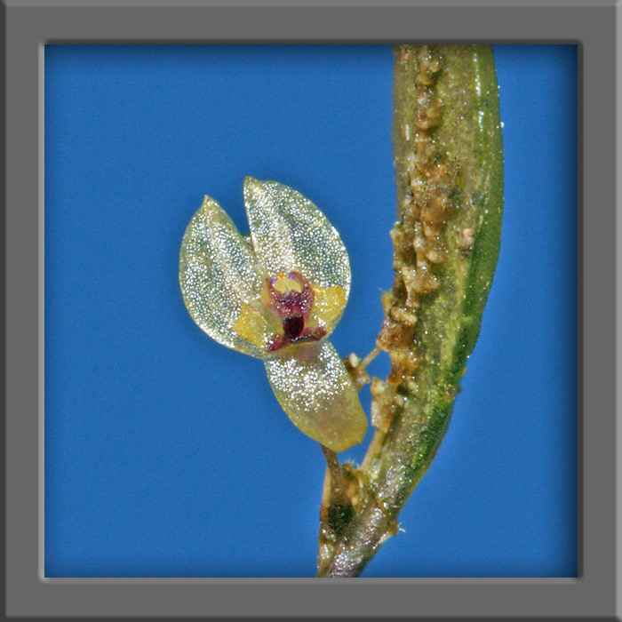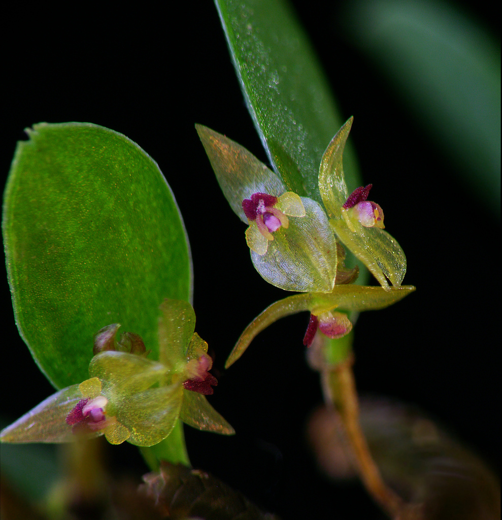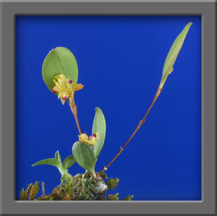 Found in Costa Rica in premontane rain forest to cloud forest and disturbed primary forests at elevations around 1500 to 1820 meters as a mini-miniature sized, warm to cool growing epiphyte with erect ramicauls enveloped completely by 4 or so lepanthiform sheaths and carrying a single, apical, erect, coriaceous, globose, obtuse, minutely tridenticulate apically leaf that blooms in the late winter and earlyspring on 1 or 2, to .2" [.5 cm] long, successively single, several flowered inflorescence,