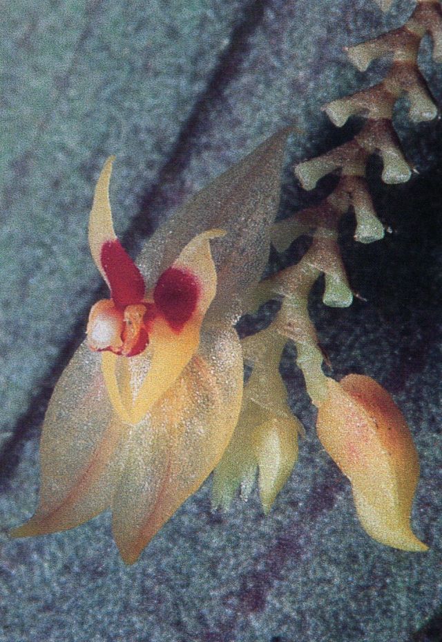 Found in west central Ecuador at elevations around 2050 to 3100 meters as a small sized, cold growing epiphyte with a slender, erect ramicaul enveloped by 12 to 15, close, glabrous to microscopically scabrous lepanthiform sheaths carrying a single, apical, erect, thinly coriaceous, oblong, long-acuminate to acute, rounded and abruptly contracted below into the petiolate base leaf that blooms in the summer on 2 to 8 congested, distichous, to 1 to 1.6" [4 cm] long, successively flowered inflorescence held in a fascile and arising on the back of the leaf.