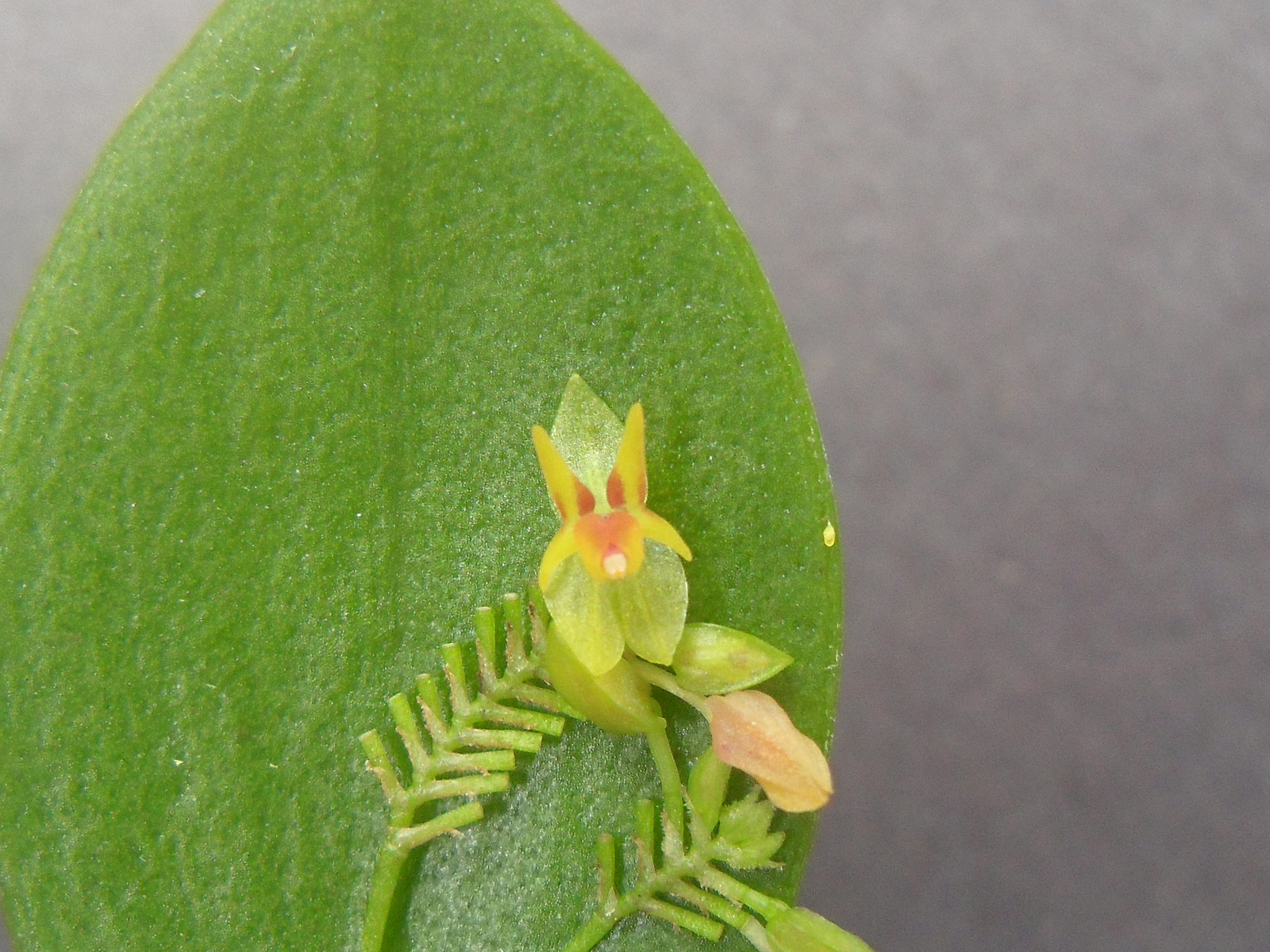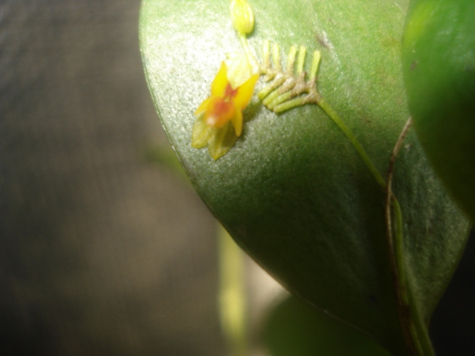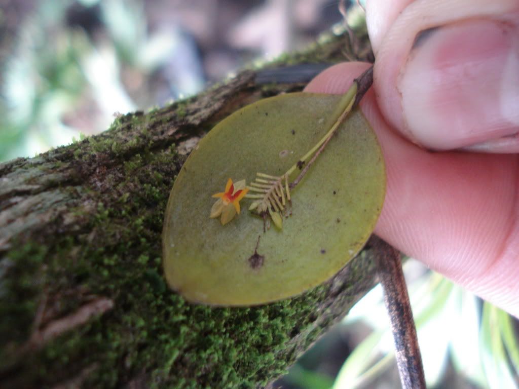 Found in Baja Verapaz, Guatemala in montane forests at elevations around 1600 meters as a miniature sized, warm to cool growing epiphyte with erect ramicauls enveloped by lepanthiform sheaths and carrying a single apical, erect, suborbicular, rounded and denticulate apically, abruptly narrowing below into the petiolate base leaf that blooms in the winter on 1 to 4, distichous, congested, .75" to 1" [2 to 2.5 cm] long, succcessively single, many flowered inflorescence arising on the back of the leaf