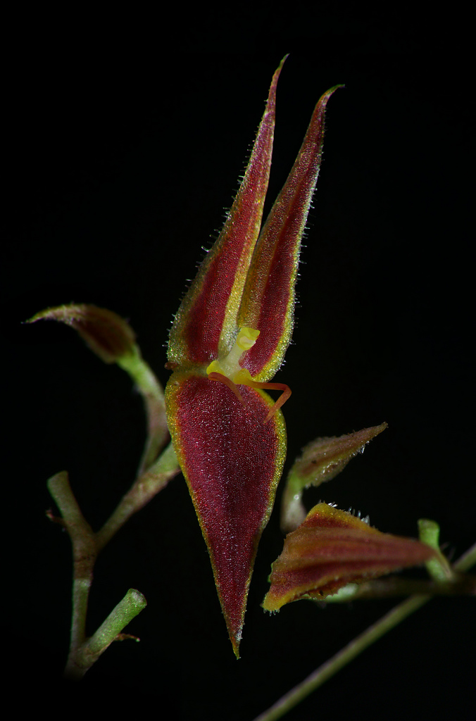 Found in Costa Rica in oak forests at elevations of 2700 to 3000 meters as a mini-miniature sized, cold growing epiphtye with slender, erect ramicauls enveloped completely by 7 to 9, lepanthiform sheaths with dilated, ciliate ostia and carrying a single, apical, erect, coriaceous, narrowly elliptic to ovate-elliptic, minutely tridenticulate apically, cuneate below into the petiolate base leaf that blooms in the spring on a, congested, distichous, successively single many flowered, to 1.2" [3 cm], racemose inflorescence arising from behind the leaf