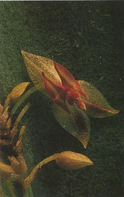 Found in Costa Rica at elevations around 1200 meters as a miniature sized, warm growing epiphyte with slender, erect ramicauls enveloped by about 10, ciliate lepanthiform sheaths and carrying a single, apical, erect, coriaceous, glabrous, ovate, obtuse-acuminate, tridentate apically cuneate below into the petiolate base leaf that blooms on a much shorter than the leaf, distichous, .6" [1.5 cm] long, densely many flowered inflorescence with lanceolate, muriculate floral bracts.