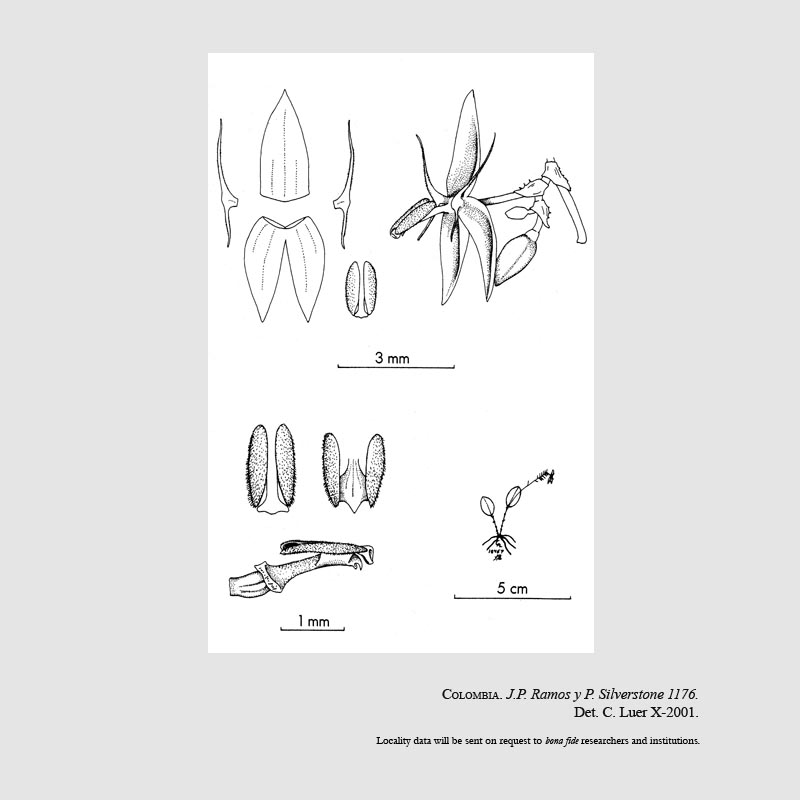 References W3 Tropicos, Kew Monocot list , IPNI ; *Orquideologia Vol 22 #1 pg 45 Luer 2001 drawing fide; Icones Pleurothallidinarum Vol XXXII Luer 2012 drawing fide; Orchids, A Colombian Treasure Vol 3 Ortiz & Uribe 2019 drawing fide;