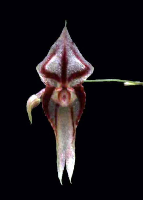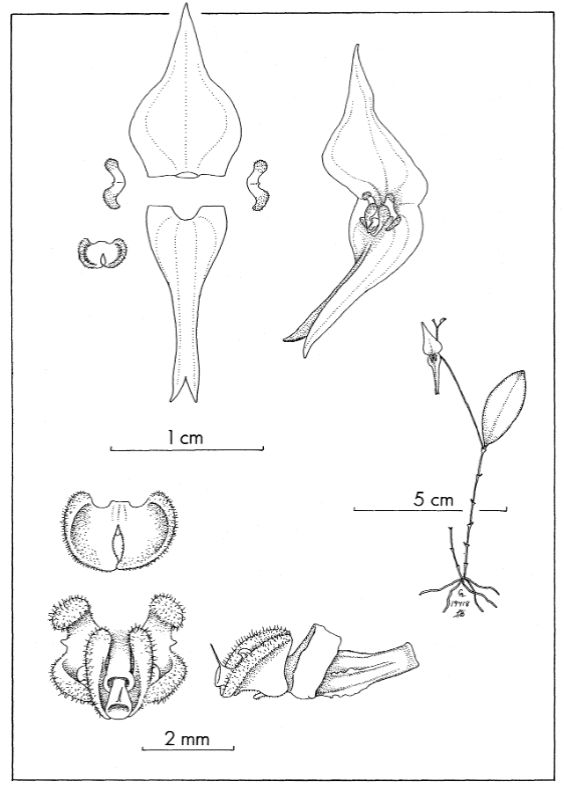 Found in Huanuco departemnt of Peru at elevations around 2700 meters as a mini-miniature sized, cold growing, caespitose epiphyte with slender, erect ramicauls enveloped by 6 to 7 microscopically ciliate lepanthiform sheaths and carrying a single apical, erect, coriaceous, elliptica, subacute to obtuse, cuneate below into the petiolate base leaf that blooms in the winter on an erect, longer than the leaf, peduncle slender, 1.2 to 1.4" [3 to 3.5 cm] long, rachis .4 to 1.2" [1 to 3 cm] long, lax, successively single, few flowered inflorescence with as longa s the pedicel floral bracts.
