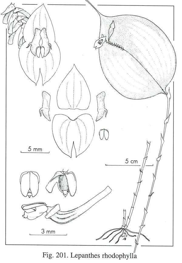 "Characterized by the tall habit with large, purple to red, subplicate, long-acuminate leaves that glow red when back lit, a long pedunculate, congested inflorescence and flowers somewhat like L cotyledon but the blades of the lip of L rhodophylla form a lid over sn ingflated sac composed of thinly dilated connectives and body which contains the column. The stigma is in contact with the appendix which is hinged to the anterior margin of the sac." Luer 1996