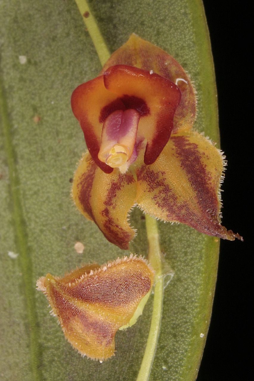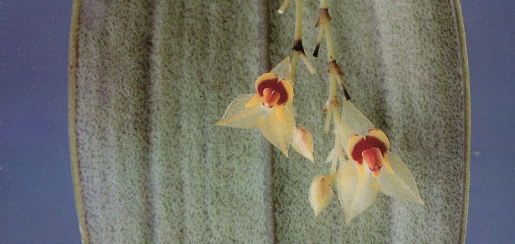 Found in Colombia and Ecuador in cloud forests at elevations of 1800 to 3300 meters as a small to medium sized, cool to cold growing epiphyte with erect, stout ramicauls enveloped by 7 to 15, microscopically ciliate, lepanthiform sheaths with oblique dilated ostia and carrying a single, apical, erect, coriaceous, more or less purple suffused beneath, elliptical-ovate, acuminate, acute, cuneate below into the petiolate base leaf that blooms in late winter and spring on a filiform, 2.4" [6 cm] long including the 1.2" [3 cm] long pedumcle, subdense, distichous, successively flowered, racemose inflorescence in a fascile of up to 10, on the back of the leaf, single to occasionally 2 simultaneously opening flowers.