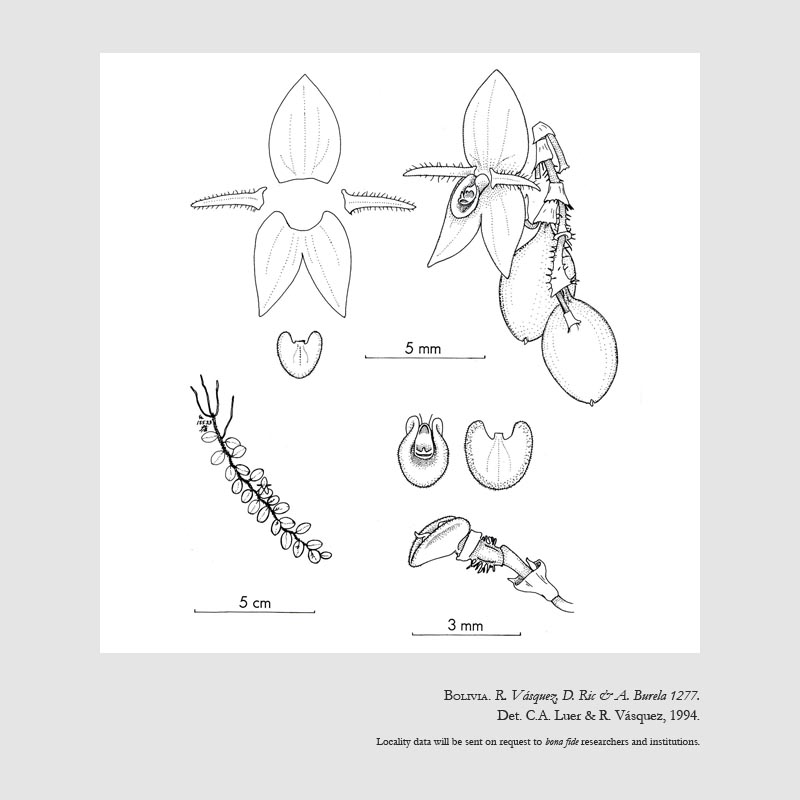 Found in Bolivia at elevations around 2380 meters as a miniature sized, cold growing epiphyte with pendant, long repent to pendent rhizomes giving rise to abbreviated ramicauls concealed by a long-spiculate lepanthiform sheath and carrying a single, apical, descending, coriaceous, glabrous, broadly elliptical, obtuse apically, 3 veined, cuneate below into the petiolate base leaf that blooms in the later spring on a single, slender, upcurved, .04" [1 mm] long, flowered inflorescence with an glabrous floral bract