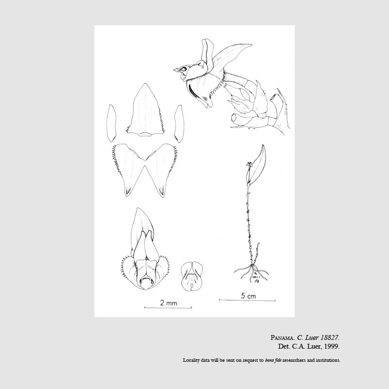 Found in Chiriqui department of Panama as a mini-miniature sized epiphyte, with slender, erect ramicauls enveloped by 13 to 15, light brown, minutely ciliate, lepanthiform sheaths with dilated ostia and carrying a single, erect, coriaceous, elliptical, slightly concave, acute, acuminate, cuneate below into the petiolate base leaf that blooms in the late spring on a filiform, congested, successively single, few flowered inflorescence arising on the back of the leaf.