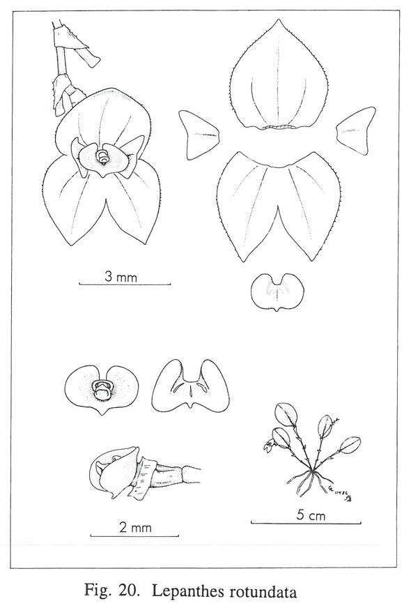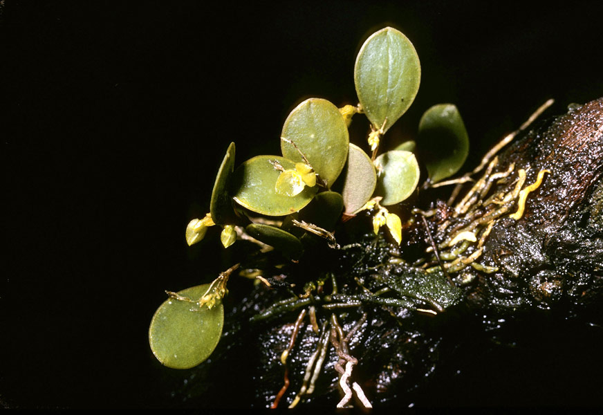 Found in eastern Jamaica at elevations around 450 to 1750 meters as a mini-miniature sized, hot to cool growing epiphyte with slender, erect ramicauls enveloped by 2 to 5, microscopically ciliate-scabrous lepanthiform sheaths and carrying a single, apical, erect, coriaceous, elliptical, obtuse, broadly cuneate below into the petiolate base leaf that blooms in the fall through late spring on a filiform, congested, distichous, .4 to .48" [1 to 1.2 cm] long including the .2 to .26” [5 to 7 mm] long peduncle, successively several flowered inflorescence arising on the back of the leaf