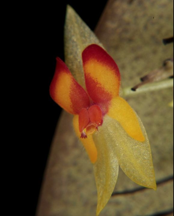 Found in Costa Rica on the Pacific watershed of the Talamanca Range in wet premontane forests at elevations around 1000 to 1200 meters as a small sized, cool growing, pendent to suberect, caespitose epiphyte with slender, suberect ramicauls enveloped by 7 to 12 minutely ciliate, blackish, tighly adpressed lepanthiform sheaths and carrying a single, apical, erect, coriaceous, ovate to elliptic, acute to acuminate, emarginate with a short apiculus, conduplicate, adaxially purplish, abaxially purplish green, not reticulated, rounded below into the short, petiolate base leaf that blooms in the late summer and early fall on an erect, arising on the back of the leaf, shorter than the leaf, peduncle .8 to 1" [2 to 2.5 cm] long, rachis .4 to .6" [1 to 12.5 cm] long, distichous, glabrous, successively single flowered inflorescence with ovate, acuminate, conduplicate, membraneous, muriculate, much shorter than the pedicel floral bracts.