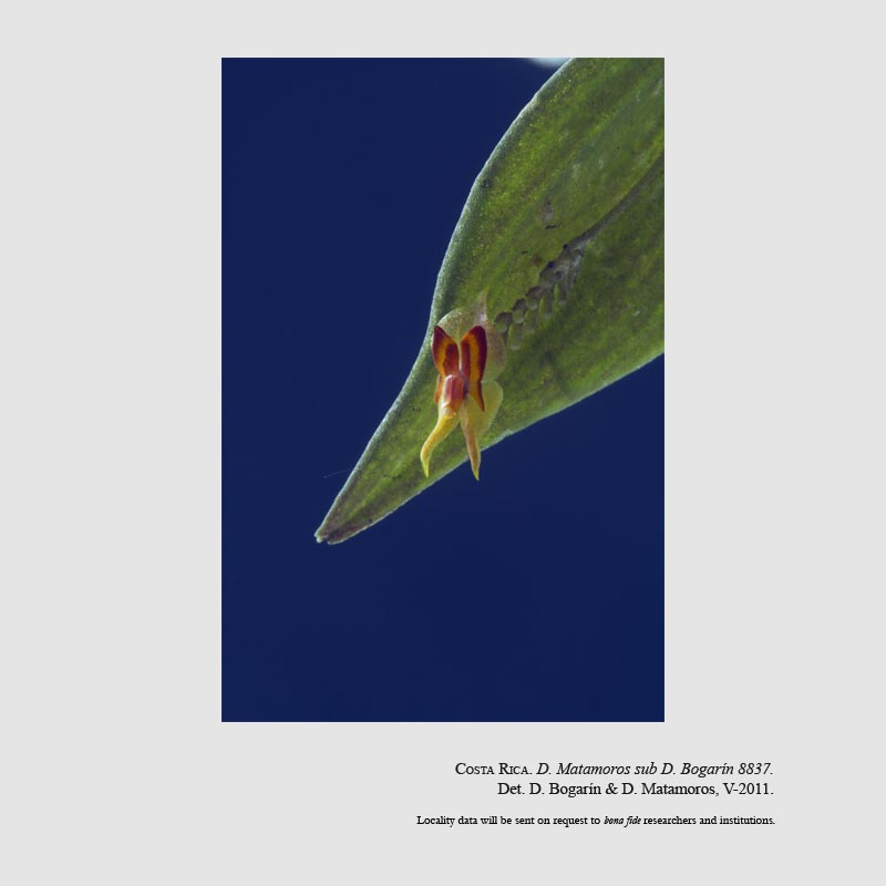 References W3 Tropicos, Kew Monocot list , IPNI ; *Lindleyana 2: 214. 1987. Luer & Escobar drawing fide; Manual de Plantas de Costa Rica Vol 3 Hammel, Grayum, Herrera and Zamora 2003; Vanishing Beauty; Native Costa Rican Orchids Vol 2 Lacaena to Pteroglossa Pupulin 2020 photo fide;