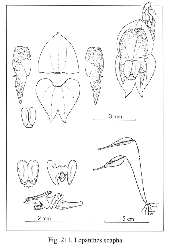 "This little species is very closely allied with the literally ubiquitous L mucronata of higher altitudes as well as its numerous allies typified by the marginal lobule between the lobes of the petals. L scapha is distinguished by the short marginal lobe of the petals, narrowly oblong connectives supporting the middle of the blades of the lip and a boat shaped appendix witha subacute prow." Luer 1996
