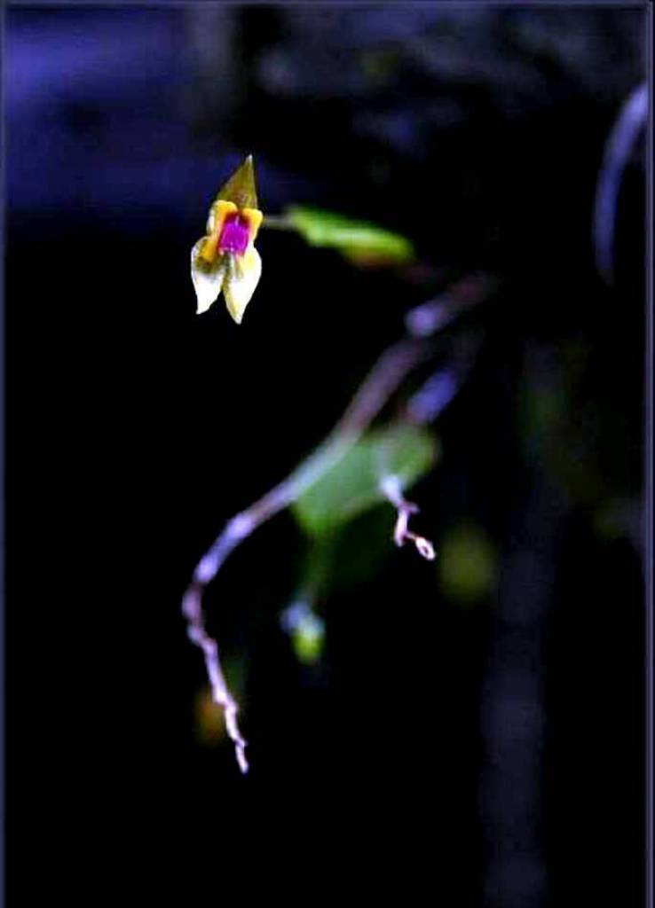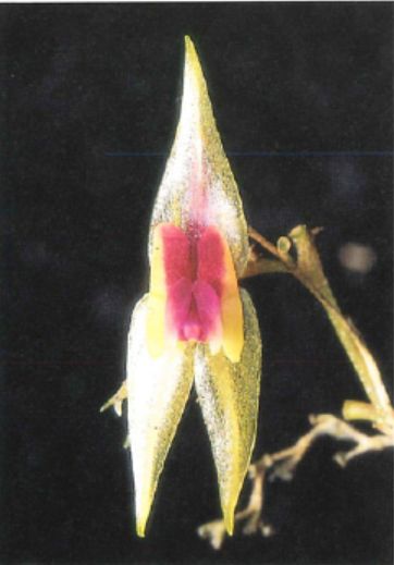 Found in Veracruz state of Mexico in wet pine/oak forests at elevations around 1900 meters as a mini-miniature sized, cool growing epiphyte with slender, suberect ramicauls enveloped by 3 to 7, densely muriculate lepanthiform sheaths with subacute ostia and carrying a single, apical, spreading, coriaceous, elliptical, acute to subacute, tridenticulate, cuneate below into the petiolate base leaf that blooms in the later spring through later summer on a filiform, distichous, flexuous, to 1.4" [3.5 cm] long including the .04” [1 mm] long peduncle, successively single, to 12 flowered inflorescence arisng on the back of the leaf and exceeds it in length