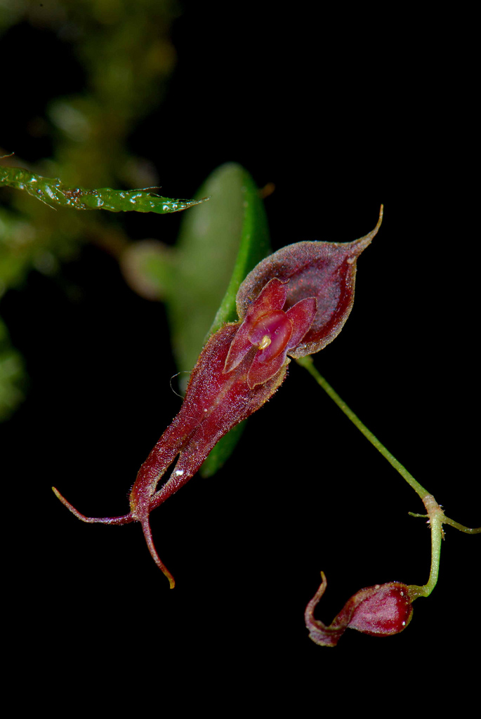 "Characterized by the loose, flexuous racemes more than twice asa long as the small, elliptical leaves. The dorsal sepal is concave with an acyuminate apex, the lateral sepals are connate into an oblong bifid lamina, the petals are transversely oblong, the lower lobe narrowly acute. The blades of the lipare glabrous and lunate witha small, segmented appendix." Luer 1996