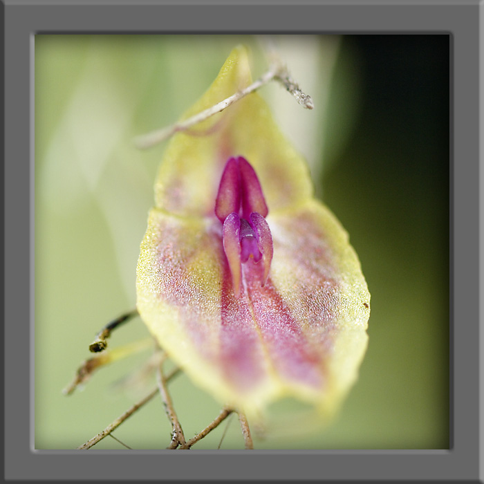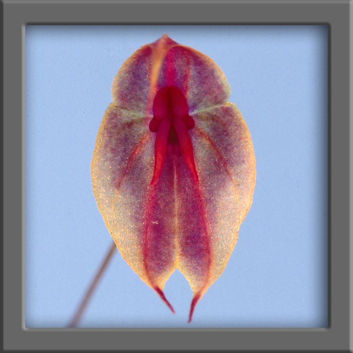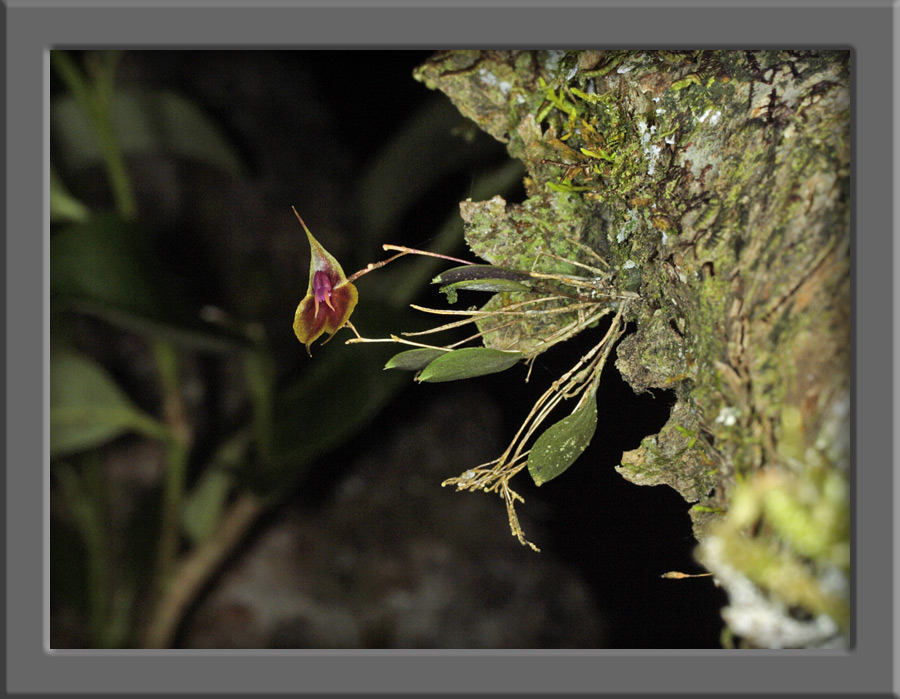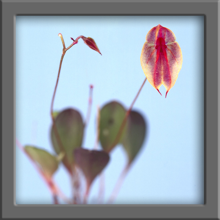 Found in Costa Rica on the Pacific slope in lower montane wet forest at about 2000 to 2350 meters as a mini-miniature sized, cold growing epiphyte with slender ramicauls enveloped by 3 blackish, microscopicaly pubescent, lepanthiform sheaths and carrying a single, coriaceous, elliptic, obtuse, cuneate basally into the petiolate base leaf that blooms in the spring on a loose, 1"[ 2.5 cm] long, successively single, few flowered inflorescence arising from behind the leaf.