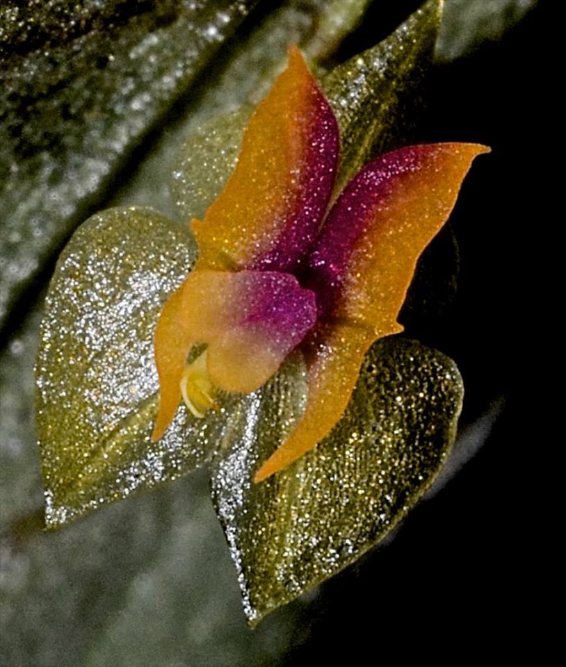 Found in Esmeraldas province of Ecuador a elevations around 1800 meters as a mini-miniature sized, cool growing, caespitose epiphyte with slender, erect ramicauls enveloped by 10 to 11 dilated, microscopically scabrous lepanthiform sheaths and carrying a single, apical, erect, coriaceous, ovate, acute, acuminate, rounded below and abruptly contracted into the petiolate base leaf that blooms in the fall on an erect, arising from the apex of the ramicaul, peduncle .16" [4 mm] long, rachis to .24" [6 mm] long, congested, distichous, successively single, many flowered inflorescence with shorter than the pedicel floral bracts.