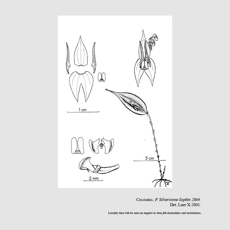 References W3 Tropicos, Kew Monocot list , IPNI ; *Orquideología Vol 22 #1 pg 50-53 Luer 2001 drawing fide; Icones Pleurothallidinarum Vol XXXII Luer 2012 drawing fide; Orchids, A Colombian Treasure Vol 3 Ortiz & Uribe 2019 drawing/photo fide