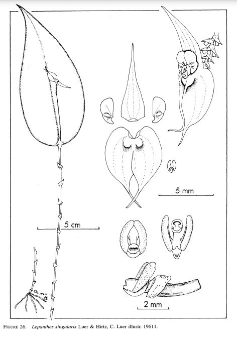 "This large species superficially resembles Lepanthes stupenda, but differs markedly in the morphology of the lip. Both species are large with a congested raceme borne behind the leaf. The dorsal sepal of both species is triangular, acute, and about .6" [1.5 cm] long. The lateral sepals of both species are broad and abruptly acuminate into slender tails about .16" [4 mm] long. Here similarities cease. A rounded callus is present on each lateral sepal of L. singularis near the base medially. An oblong callus overlies the midvein of the petals with an oblong upper lobe and a short, uncinate lower lobe. The blades of lip are supported by .04" [1 mm] long connectives at the apex with a protruding boat-shaped appendix that lies beneath and against the stigma of the column." Luer & Hirtz 2009