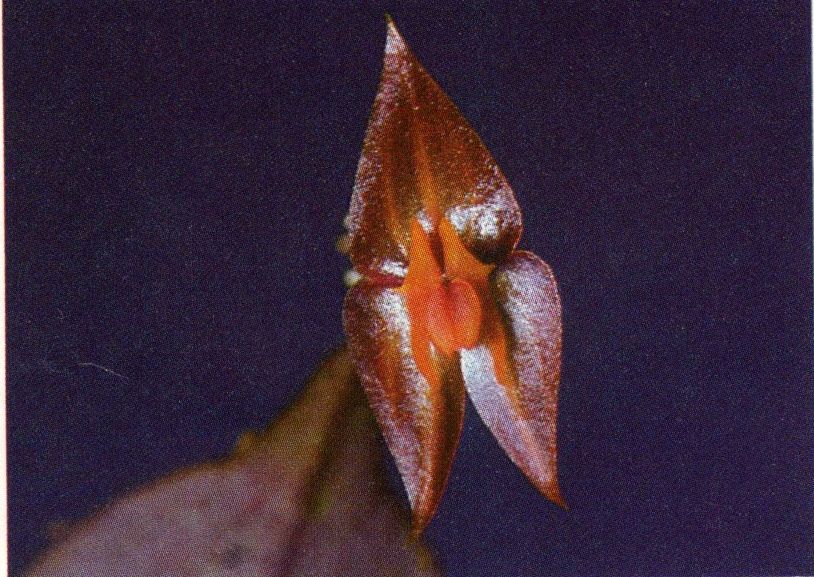 Found in Norte de Santander department of Colombia in wet forests at elevations around 1800 to 2250 meters as a miniature sized, cool to cold growing epiphyte with erect, slender ramicauls enveloped by 8 to 11, close fitting, microscopically ciliate, lepanthiform sheaths and carrying a single, thinly coriaceous, purple beneath, erect, ovate, long-acuminate, rounded to cuneate and contracted below into the petiolate base leaf that blooms in the later spring and summer on a filiform, congested, distichous, 1.52" [3.8 cm] long including the 1.2” [3 cm] long peduncle, successively flowered inflorescence arising on the top to beyond the apex of the leaf.