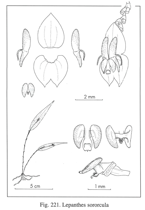"The narrowly ovate leaves are held horizontally by weak stems and the flowers are produced in congested racemes on top of the leaf. There can be, as in L mucronata, 2 simultaneously occuring racemes one on top of the other. The apices of the petals are not truncate in L sororcula also the blades of the lip are more or less fleshy and held to either side of the column." Ler 1996