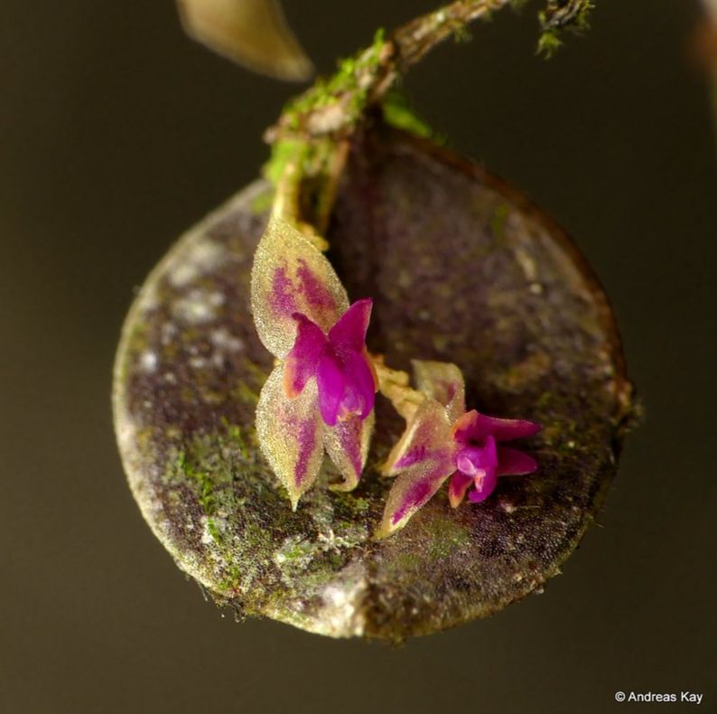 "Distinguished by the very small size, very small, convex, orbicular leaves that are held horizontally. The minute flowers are borne within the cavity beaneath the leaf. The most remarkable feature is the concave, long-pubescent appendix of the lip." Luer 1996