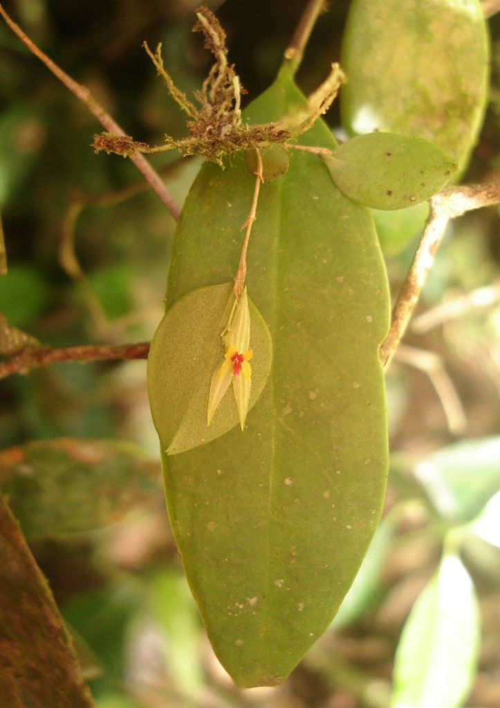 Found in Valle de Cauca department of Colombia and Zamora Chinchipe province of Ecuador in cloud forests at elevations around 1500 to 1800 meters as a mini-miniature sized, cool growing epiphyte with slender, erect, ramicauls enveloped by 5 to 6, ribbed, oblique, non-dilated, microscopically ciliate, lepanthiform sheaths and carrying a single, apical, erect, coriaceous, ovate, acute, broadly cuneate below into the petiolate base leaf that blooms in the suumer through fall on 1 to 2, very congested, distichous, .93 to .96" [2.32 to 2.4 cm] long including the .32” to .4” [8 to 10 mm] long peduncle, successively many flowered, racemose inflorescence arising from behind the leaf, with ciliate floral bracts.