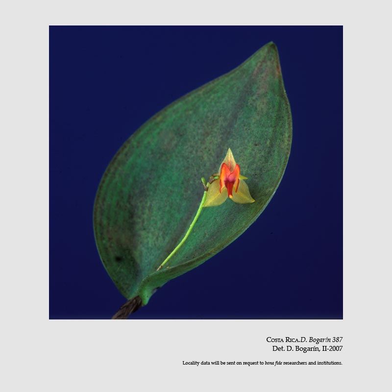 Found in Costa Rica in premontane rain forest to cloud forest and disturbed primary forests at elevations around 1500 to 1640 meters as a small sized, cool growing epiphyte with slender, erect ramicauls enveloped by 6 to 11, blackish, minutely ciliate lepanthiform sheaths with oblique ostia and carrying a single, apical, erect, coriaceous, ovate, acute, basally rounded and contracted into the petiolate base leaf that blooms in the spring on a congested, distichous, 1.4" [4.1 cm] long, successively single, many flowered inflorescence arising on the back of the leaf.