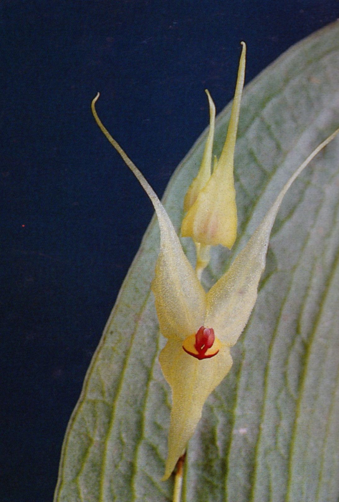 Found in Colombia and northwestern Ecuador in wet montane and scrub cloud forests at elevations aound 1200 to 3200 meters as a small to medium sized, warm to cold growing epiphyte with slender, erect ramicauls enveloped by 8 to 14 lepanthiform sheaths with minutely ciliate margins and carrying a single, apical, erect, thinly coriaceous, reticulated, elliptical-ovate, acute, acuminate, cuneate to rounded below and contracted into the petiolate base leaf that blooms in the fall and spring on a slender, congested, distichous, to 2.32" [to 5.8 cm] long including the .6 to 1.12” [1.5 to 2.8 cm] long peduncle, filiform, successively many flowered, racemose inflorescence arising from behind the leaf.