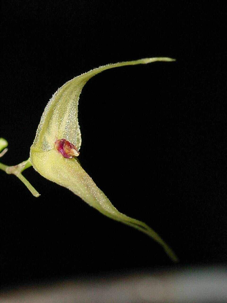 "Identified by the congersted raceme much shorter than the large leaf with an acuminate apex. The flowers are large, more than 1.2" [3 cm] tall. The sepals are pubescent below the middle, thepetals are small and obtuse and the blades of the lip are ovate. The appendix is a minute pedunculate organ at the apex of the sinus." Luer 1996