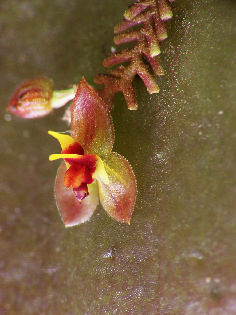 Found in Costa Rica in a shaded and humid locations next to a creeks at elevations of 650 to 1400 meters as a mini-miniature sized, warm to cool growing epiphyte with very slender, erect ramicauls enveloped by 8 to 10, minutely pubescent to papillose, lepanthiform sheaths with dilated ostia and carrying a single apical, erect, coricaeous, ovate, abruptly narrowing above to a tridenticulate apex, abruptly contracted below into the petiolate base leaf that blooms in the winter and spring on 1 to 3, much shorter to close to the leaf in length, filiform, .8" [2 cm] long, dense, distichously, successively many flowered inflorescence