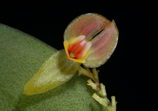 Found in Ecuador at elevations of 2500 to 2700 meters as a miniature sized, cold growing epiphyte with erect, slender ramicauls enveloped by 7 to 10, long-ciliate, lepanthiform sheaths and carrying a single, apical, erect, coriaceous, elliptical, subacute at both ends and cuneate into the petiolate base leaf that blooms in the fall on a congested, distichous, 1" [2.5 cm] long, successively many, single flowered inflorescence arising from beneath the leaf.