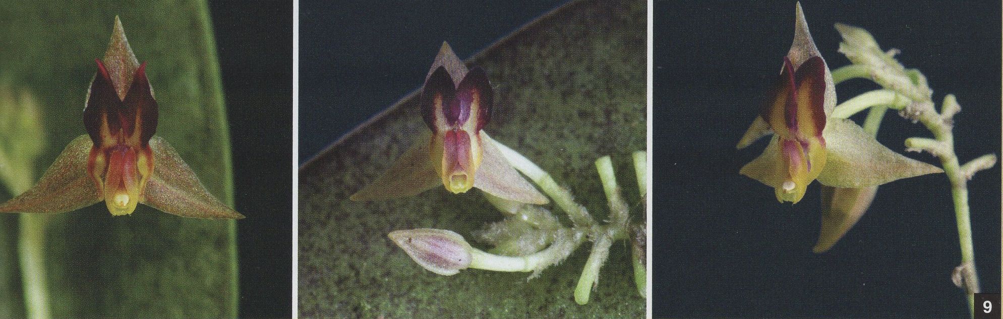 Found in Costa Rica in primary and secondary oak cloud forests at elevations around 2418 to 2553 meters as a miniature to small sized, cold growing epiphyte with slender, erect to suberect ramicauls enveloped by 12 minutely ciliate, blackish lepanthiform sheaths with ovate, acute, minutely ciliate ostia and carrying a single, coriaceous, narrowly elliptic to elliptic, acute, conduplicate, abaxially cuneate, emarginate, with a short apiculus, roundish base narrowing into the short, petiolate base leaf that blooms at any time of the year but mostly later spring through late fall on a racemose, distichous, glabrous, peduncle 1" [2.5 cm] long, to 1.16" [2.9 cm] long overall, rachis .16" {4 mm] long, successively single, few flowered inflorescence arising on the back of the leaf, shoerter than the leaf, with ovate, acuminate, conduplicate, membraneous, muriculate, as long as the pedicel floral bracts.