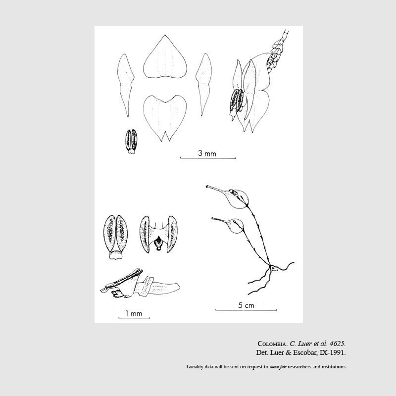 References W3 Tropicos, Kew Monocot list , IPNI ; *Orquideología 18(2): 148. 1991 drawing fide; Icones Pleurothallidinarum Vol XXXII Luer 2012 drawing fide; Orchids, A Colombian Treasure Vol 3 Ortiz & Uribe 2019 drawing fide;