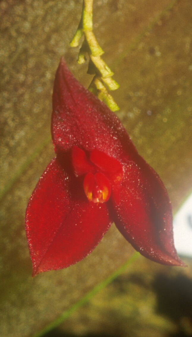 "Distinguished by the large habit with large red flowers produced in a congested raceme held behind the leaf. The sepals are shortly pubescent within with the laterals broad, obtuse and concave." Luer 1996