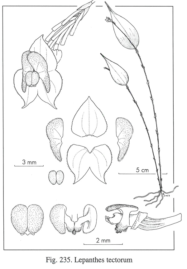 "Similar to L grypha but L tectorum is distinguished by the more oblong leaves instead of narrowly ovate, shortly pubescent petals instead of long pubescent, broader blades of the lip, a tripartitr appendix instead of oblong with an apicle glandule and a thicker colum with a subapical stigma instead of a completely flat, ventral anther. Also similar to L reventador but L tectorum has long-pedicellate flowers on a raceme behind the leaf and the appendix is tripartite instead of on top of the leaf and the appendix is a minute filament." Luer 1996