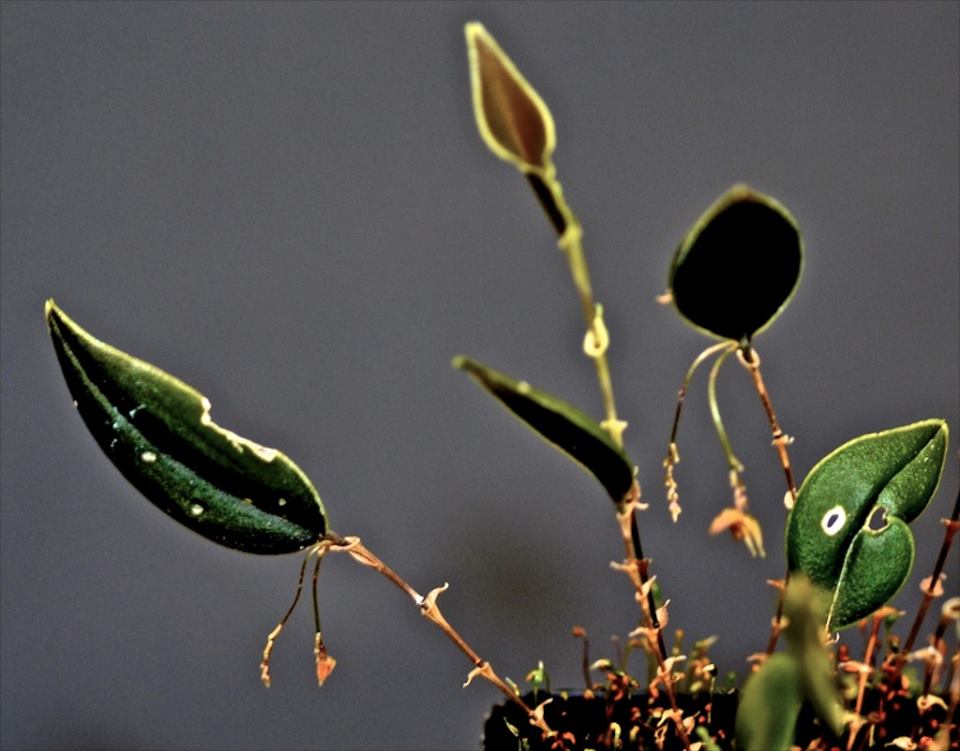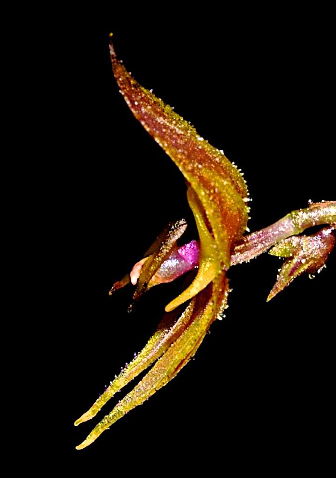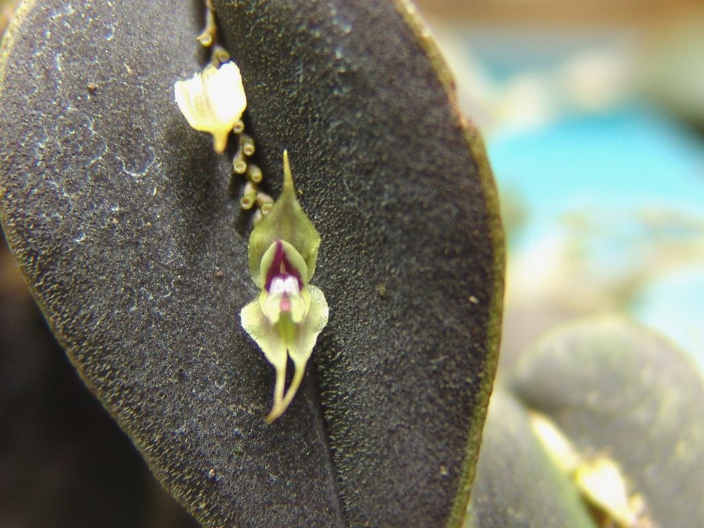 Found in El Oro province of Ecuador at elevations around 1850 to 2400 meters as a miniature sized, cool to cold growing epiphyte with a slender, suberect ramicaul enveloped by 8 to 11, lepanthiform sheaths with markedly ciliated ostia carrying a single, apical, purple suffused, spreading, thickly coriaceous, elliptic-ovate, acute, wide expanded, sulcate medially with both halves convex, cuneate below into the petiolate base leaf that blooms in the fall on a slender, congested, secund, to 2" [to 5 cm] long, successively many flowered inflorescence arising on the top side of the leaf within the sulcus.