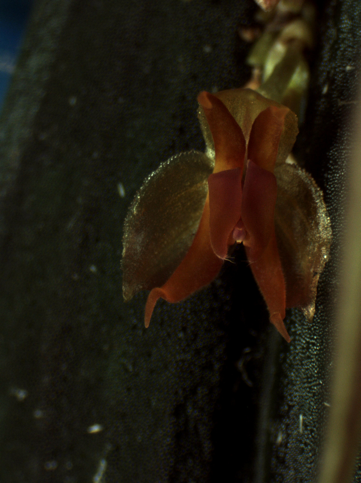 Found in Antioquia department of Colombia in cloud forests at elevations around 2500 to 2700 meters as a mini-miniature sized, cold growing epiphyte with erect, slender ramicauls enveloped completely by 7 to 9, microscopically cilate, lepanthiform sheaths and carrying a single, apical, erect, coriaceous, elliptical, subacute, cuneate below into the petiolate base leaf that blooms in the later spring on a filiform, congested, distichous, subsecund, .32 to .4" [8 to 10 mm] long including the .12 to .2” [3 to 5 mm] long peduncle, successively several flowered, inflorescence arising on the top of the leaf with.