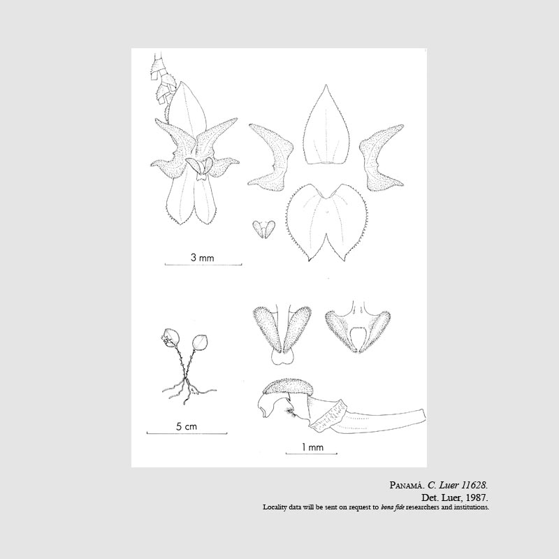 Found in Chirique Panama in cloud forests at elevations above 2000 meters as a mini-miniature sized, cold growing epiphyte with erect, slender ramicauls enveloped completely by 7, minutely cilate, lepanthiform sheaths and carrying a single, apical, erect, thickly coriaceous, broadly elliptical, obtuse, rounded and contracted below into the petiolate base leaf that blooms on a filiform, congested, distichous, .2 " [5mm] long including the .12 ” [3 mm] long peduncle, successively several flowered, inflorescence arising on the back of the leaf with muriculate floral bracts.