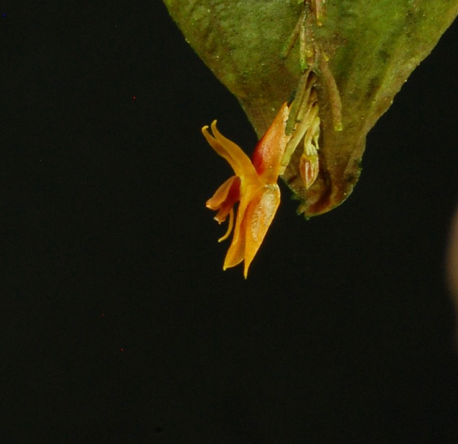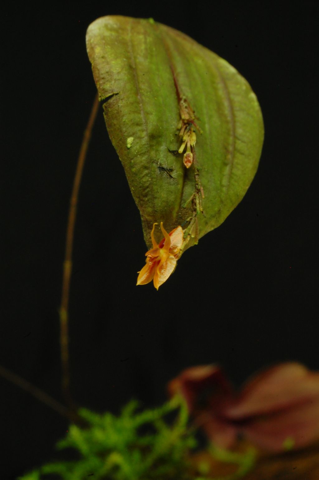 Found in Esmeraldas province of Ecuador at elevations around 800 meters as a miniature sized, warm growing epiphyte with a slender, suberect ramicaul enveloped by 10 to 12, microscopically ciliate lepanthiform sheaths with oblique long-attenuate ostia carrying a single, apical, erect, rigid,narrowly linear, acute, channeled, sulcate medially with both halves convex, contracted below into the petiolate base leaf that blooms on a filiform, very congested, to .6 to 1.2" [1.5 to 3 cm] long, successively many flowered inflorescence arising on the top side of the leaf.