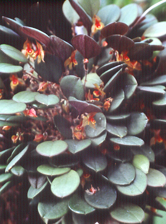 This epiphytic mini-miniature is found at lower elevations in Suriname but can be grown in moderate shade and with hot to cool conditions and has erect, slender ramicauls enveloped by 6 lepanthiform sheaths carrying a single, apical, elliptic, obtuse, gradually narrowing below into the base leaf and blooms on a terrminal, .4" [1cm] long, successively single, few flowered inflorescence.