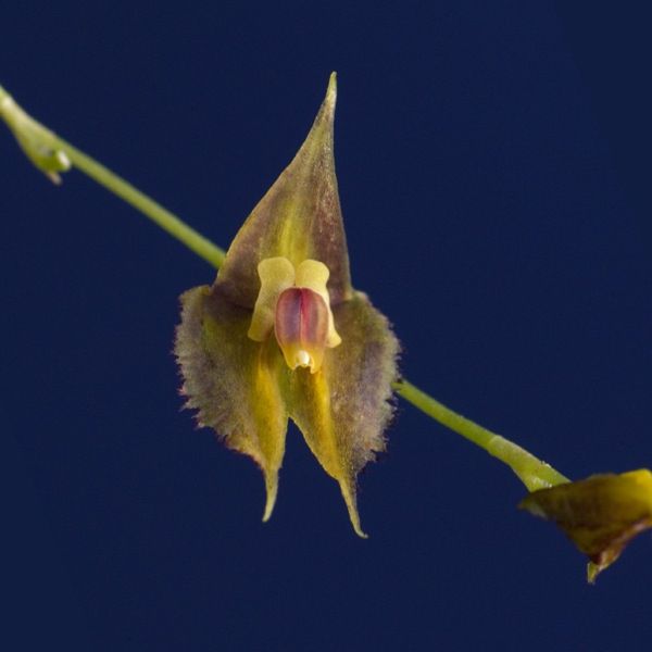 Found in Morona-Santiago Ecuador at elevations around 1500 meters as a miniature sized, cool growing, prolific epiphyte with comparitively stout, erect to suberect, prolific ramicauls enveloped by 7 to 8, ribbed, minutely ciliate, lepanthiform sheaths with minimally dilated ostia and carrying a single, apical, erect, narrowly elliptical, subacute to rounded apically, cuneate below into the petiolate base leaf that blooms in the spring on an erect, arching, lax, secund, .92" [2.3 cm] long, successively many flowered inflorescence