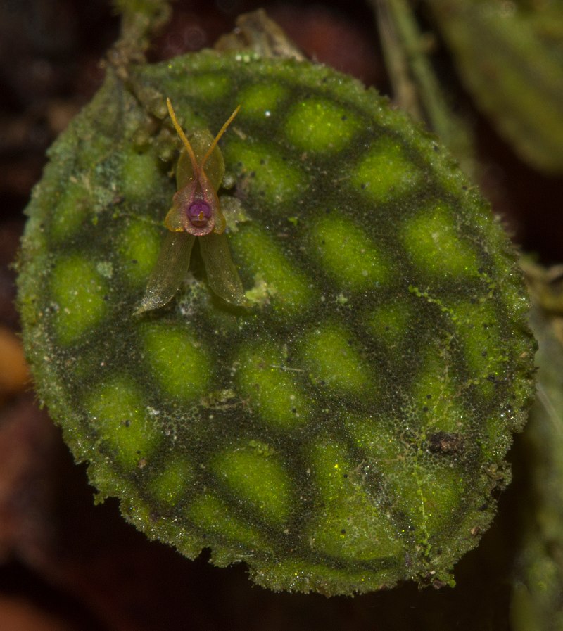 Found in Pichincha province of Ecuador in cloud forests at elevations around 1200 meters as a mini-miniature sized, cool growing epiphyte with erect, slender ramicauls enveloped completely by 5 to 6, microscopically cilate-pubescent, lepanthiform sheaths and carrying a single, apical, erect, thinly coriaceous, green with brown reticulation, elliptical, rounded apically, markedly sinuate margins, rounded and contracted below into the petiolate base leaf that blooms in the spring on a congested, distichous, .16 " [4 mm] long including the .08 ” [2 mm] long peduncle, successively several flowered, inflorescence .