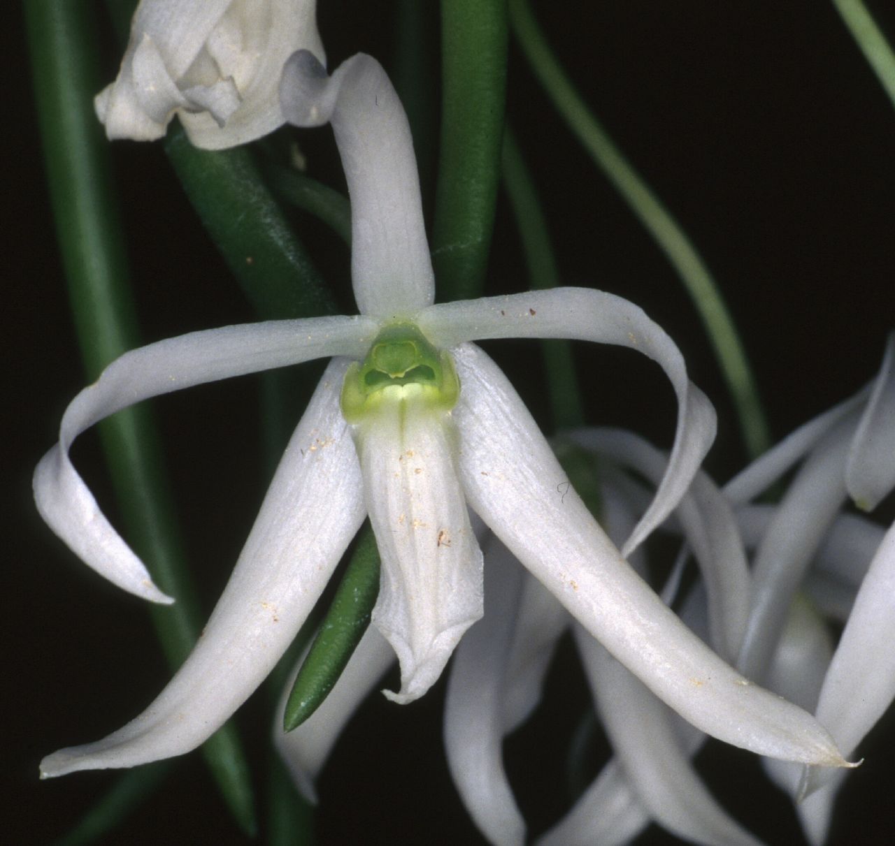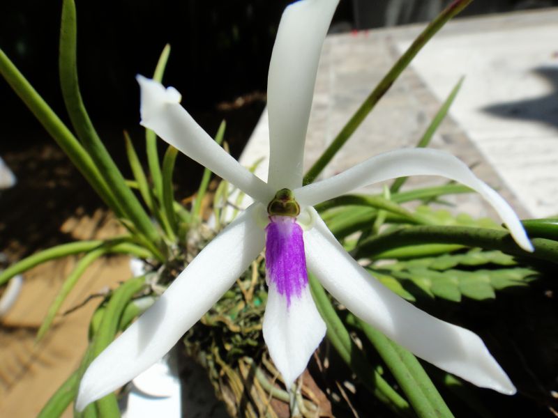 A beautiful, miniature, warm growing epiphyte from Brazil and Paraguay in subtropical rainforest and coastal mountains at elevations of 500 to 900 meters with terete pencil-like psuedobulbs covered basally by several membraneous sheaths and has a single, apical, erect or spreading, subcylindric, acute, deeply grooved dorsally, shiny, dark green leaf, and large, 1 to 3, successively opening, fragrant vanilla scented flowers on a 3/4" [2 cm] long, inflorescence shorter than and arising from the base of the leaves, occuring in the late winter or early spring.