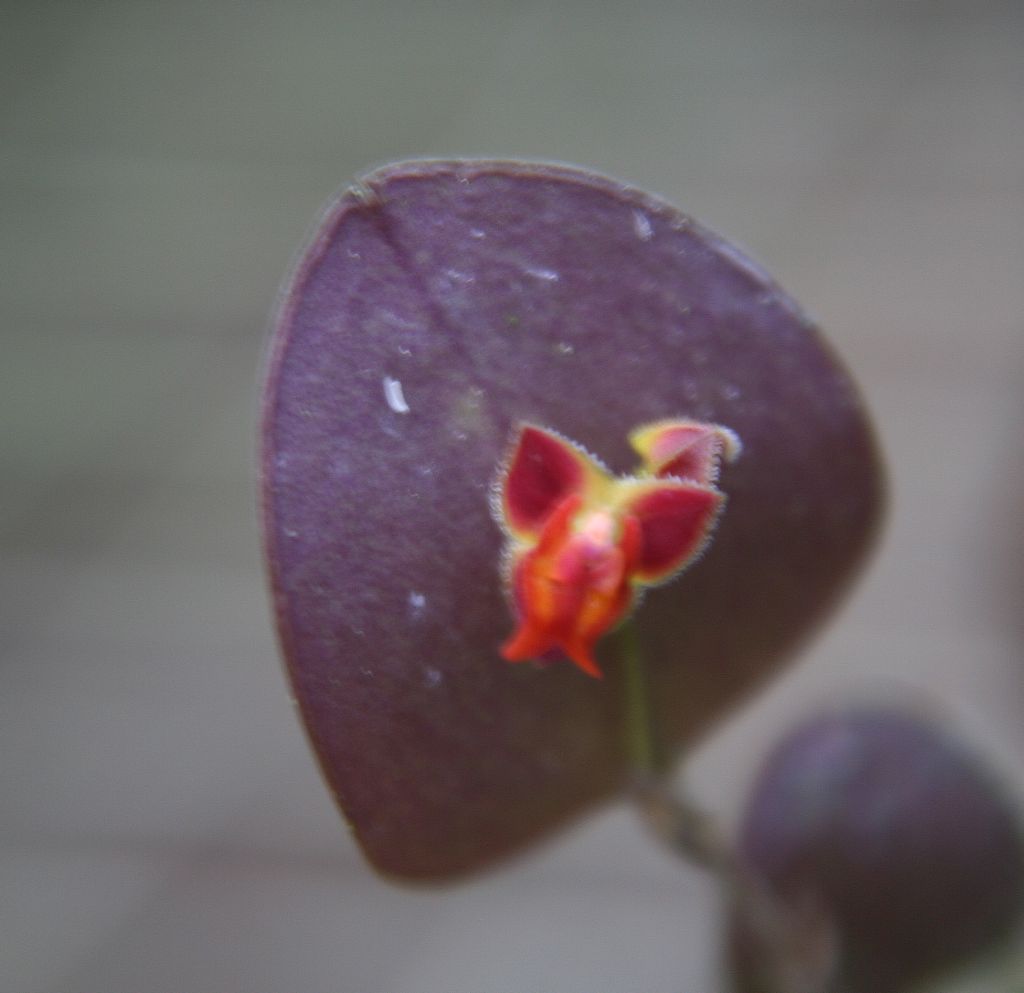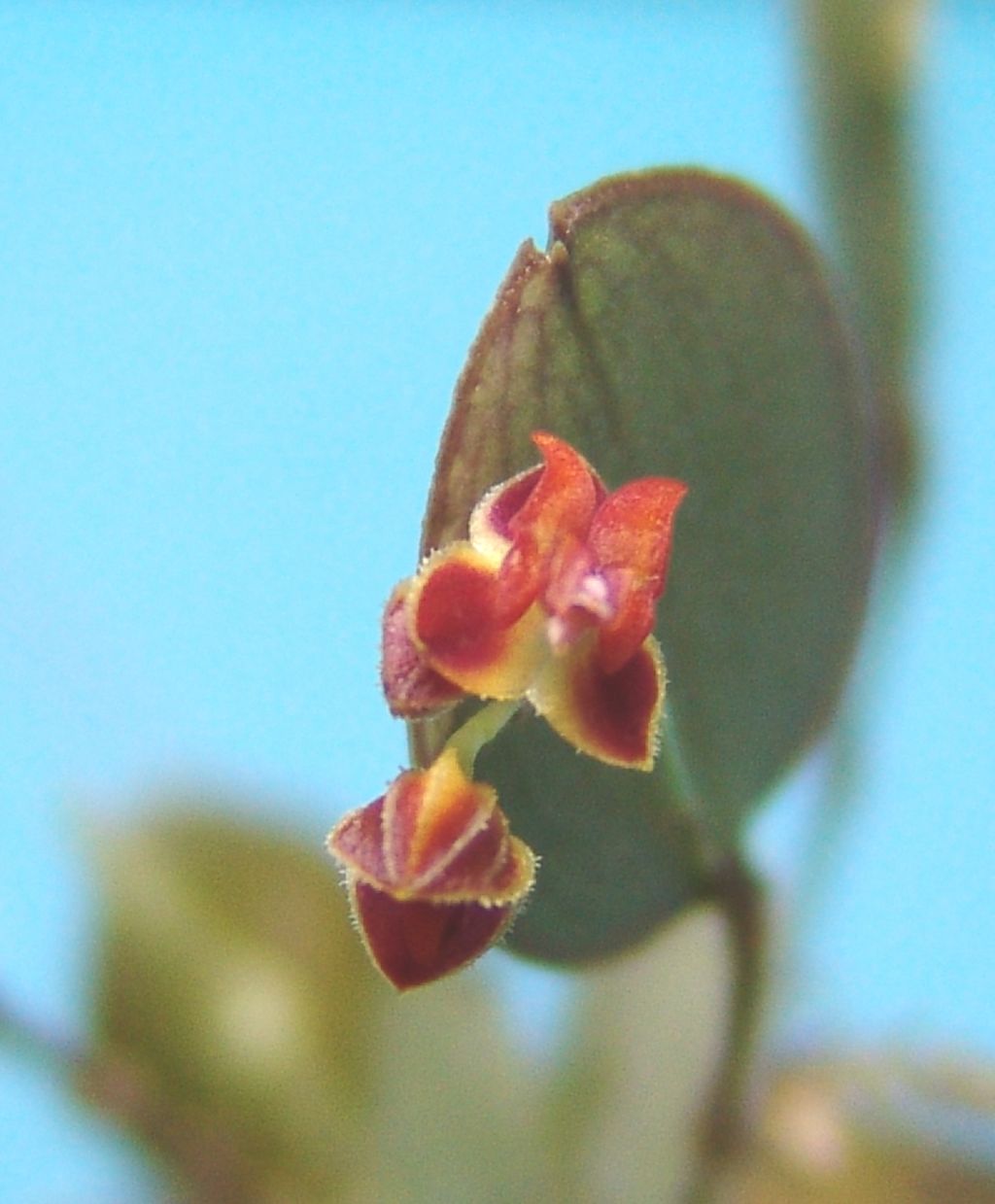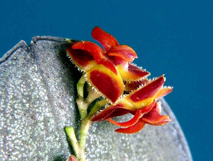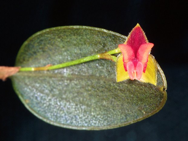 "Characterized by the small, rigid, purplish, broadly ovate, obtuse leaf subcordate at the base and slightly convex with a congested raceme of colorful flowers borne beneath. The sepals are coarsely denticulate. The upper lobes of the petals are uncinate with the apices pointed outwards. The blades of the lip are ovate and concave and the appendix is large, pubescent and oblong with a terminal gland." Luer 1996