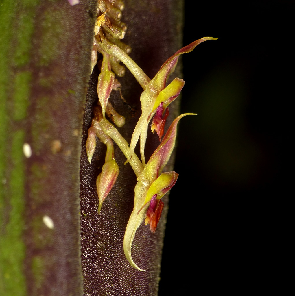 Found in southwestern Colombia and northern Ecuador at elevations around 3100 to 3450 meters as a miniature sized, cold growing epiphyte with a slender, suberect ramicaul enveloped by 9 to 11, close fitting, ciliate lepanthiform sheaths with markedly dilated ostia carrying a single, apical, suberect, thinly coriaceous, reticulate, ovate, acuminate to acute, rounded and abruptly contracted below into the petiolate base leaf that blooms in the later summer through fall on a filiform, congested, disitchous, to .68" [1.7 cm] long including the .48" [1.2 cm] long peduncle, successively several flowered inflorescence arising on the back of the leaf.