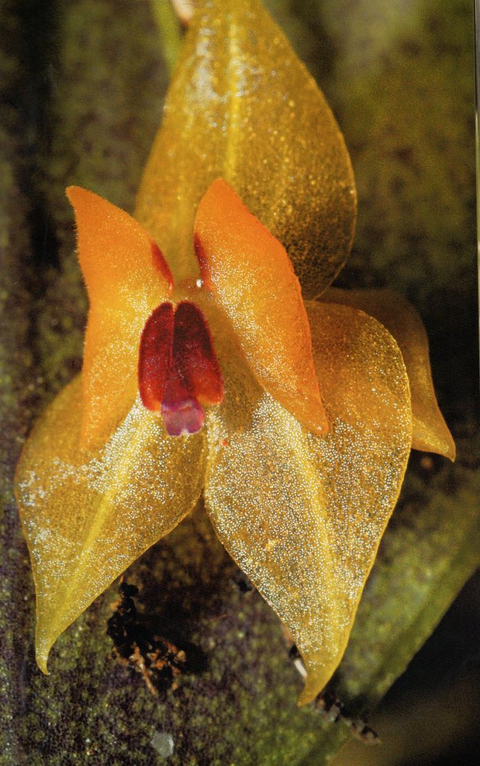 Found in southeastern Cuba as a mini-miniature to miniature sized, caespitose, cool growing epiphyte with erect, slender ramicauls enveloped by up to 10, narrow, infundibuliform, acuminate lepanthiform sheaths with glabrous, striae, papilose-hispid ostia and carrying a single, apical, broadly ovate, glabrous, entire margins, subacuminate, minutely tridenticulate, rounded below intothe petiolate base leaf that blooms at most any time of the year on up to 4, arising on the back side of the leaf, slender, distichous, .6" [to 1.5 cm] long, successively single, several flowered inflorescence with dilate, acuminate, ciliate floral bracts and carrying small, diaphanous flowers
