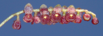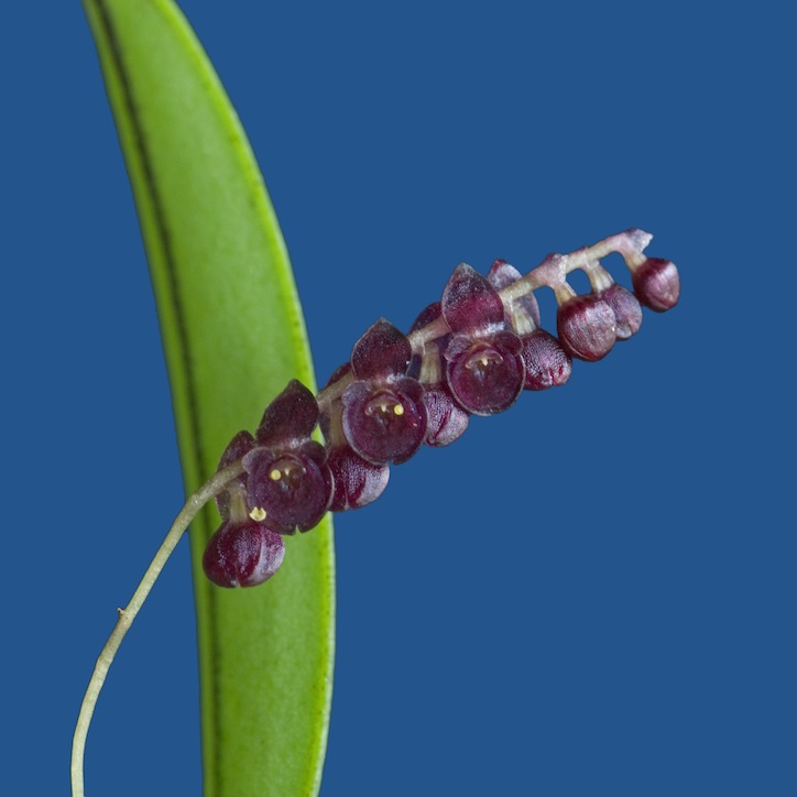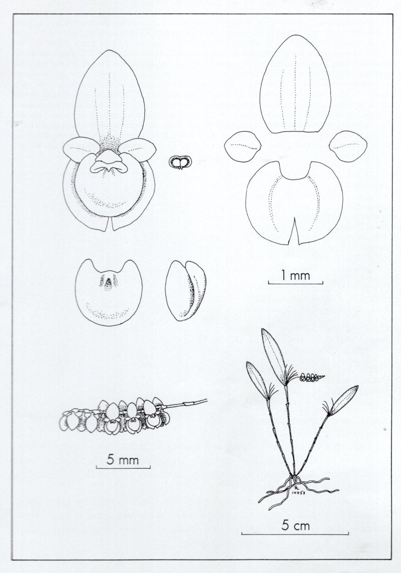 Found in southern Ecuador at elevations of 1800 meters as a mini-miniature sized, cool growing epiphyte with erect, slender ramicauls enveloped by 6 to 7, blackish, minutely ciliate-scabrous, leapanthiform sheaths and carrying a single, apical, erect, coriaceous, narrowly elliptical, acute, cuneate below into the petiolate base leaf that blooms in the winter on a congested, simultaneously several flowered, .8" [2 cm] long including the .4" [1 cm] long peduncle, 2 ranked inflorescence arising from near the apex of the ramicaul
